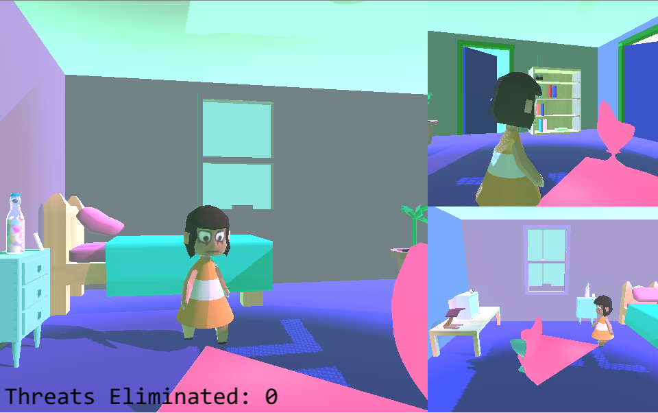 Protection Reconnaissance Intelligence Sexy Man or P. R. I. S. M. (2018) is a first-person shooter in which you, an NSA agent, protect a little girl from harm by invading aliens by moving around using different cameras placed around her room.